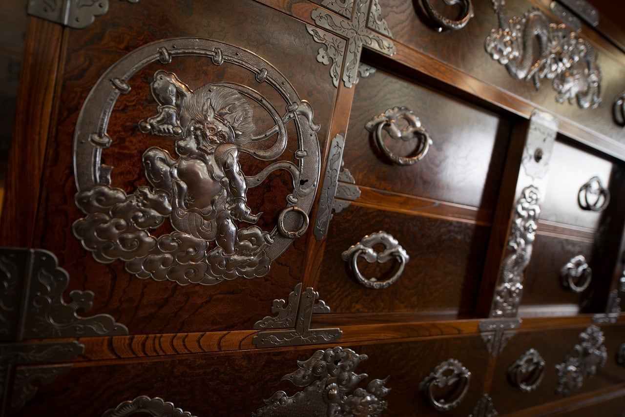鮮やかに彫金された「風神・雷神」が左右に配置され、一番上の引出しには「龍」、下の引出しには「獅子」の金具を飾り付けた五尺箪笥(巾150cm)です。また、中央の引出しには「閂(かんぬき)」が差し込まれている伝統的なデザインです。和室にはもちろん、洋室に置いても空間に調和する傑作品です。